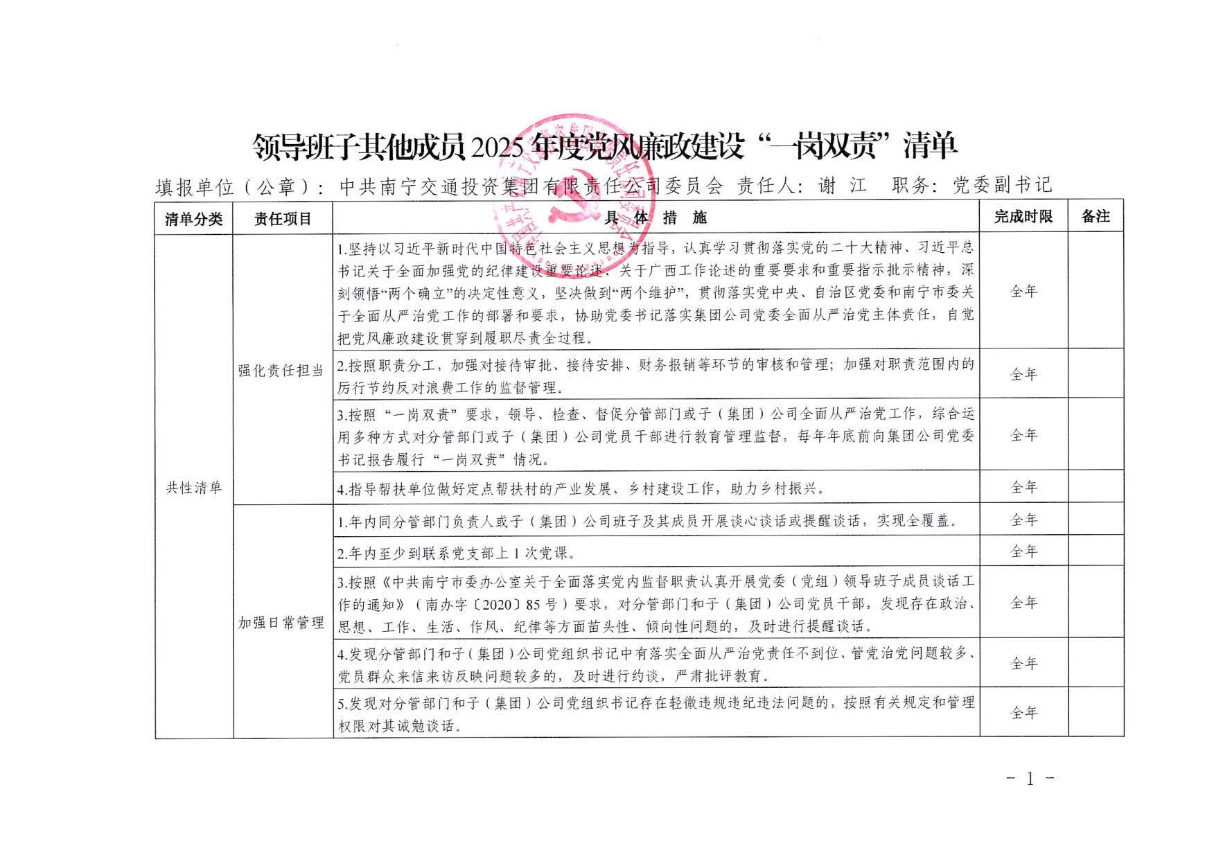 南寧交投集團領(lǐng)導(dǎo)班子其他成員2025年度黨風(fēng)廉政建設(shè)“一崗雙責”清單(一)