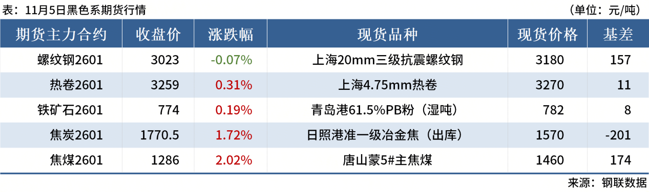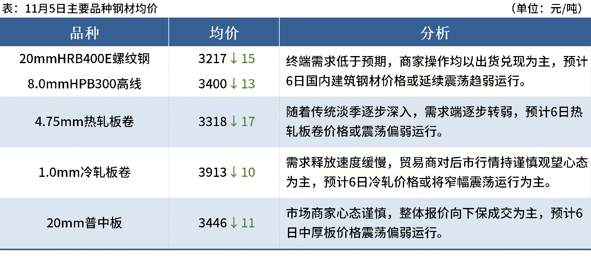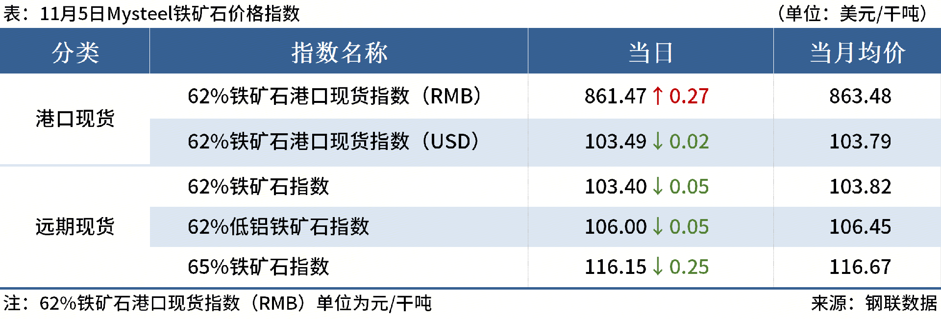 ◎11月5日,全國主港鐵礦石成交108.80萬噸,環(huán)比減25.5%;237家主流貿(mào)易商建筑鋼材成交9.39萬噸,環(huán)比增1.3%。