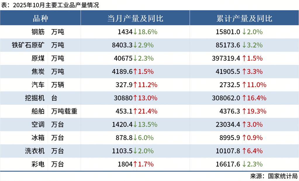 ◎國家統(tǒng)計局最新數據顯示,2025年10月份,中國鋼筋產量為1434.0萬噸,同比下降18.6%;1-10月累計產量為15801.0萬噸,同比下降2.0%。其他主要工業(yè)品情況如下: