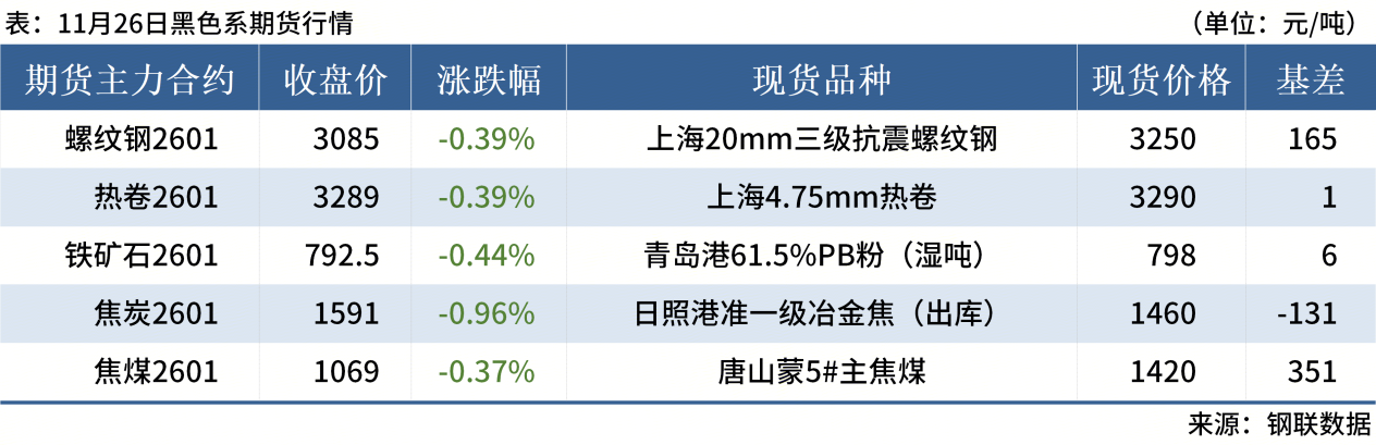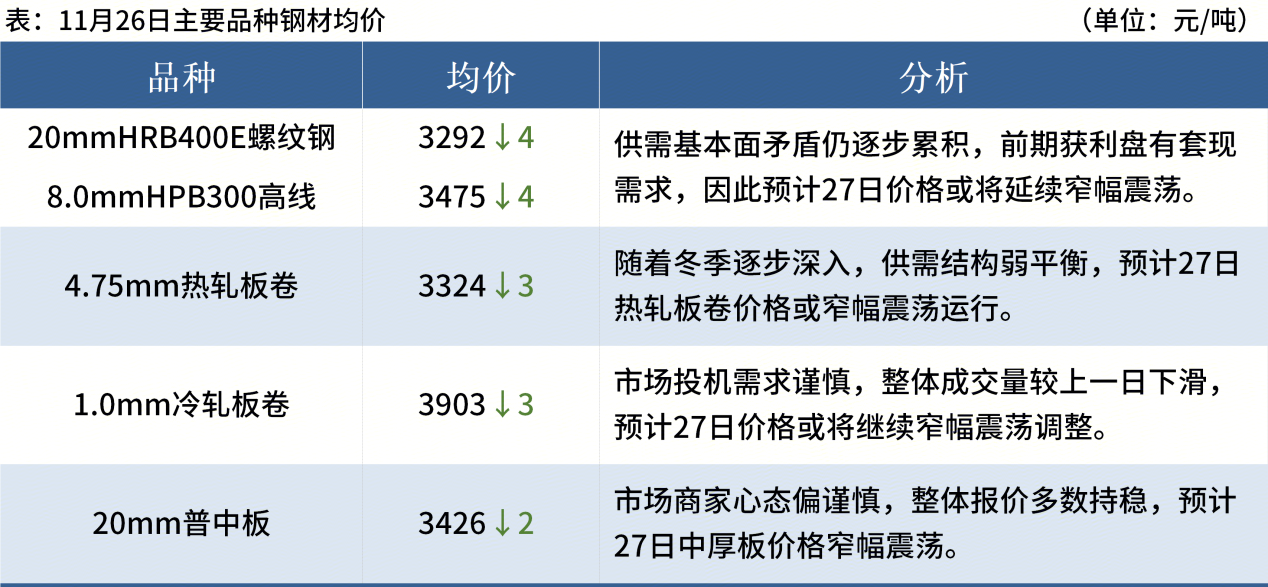 ◎ 11月26日,全國主港鐵礦石成交103.30萬噸,環(huán)比增5.9%;237家主流貿(mào)易商建筑鋼材成交9.32萬噸,環(huán)比減8.1%。