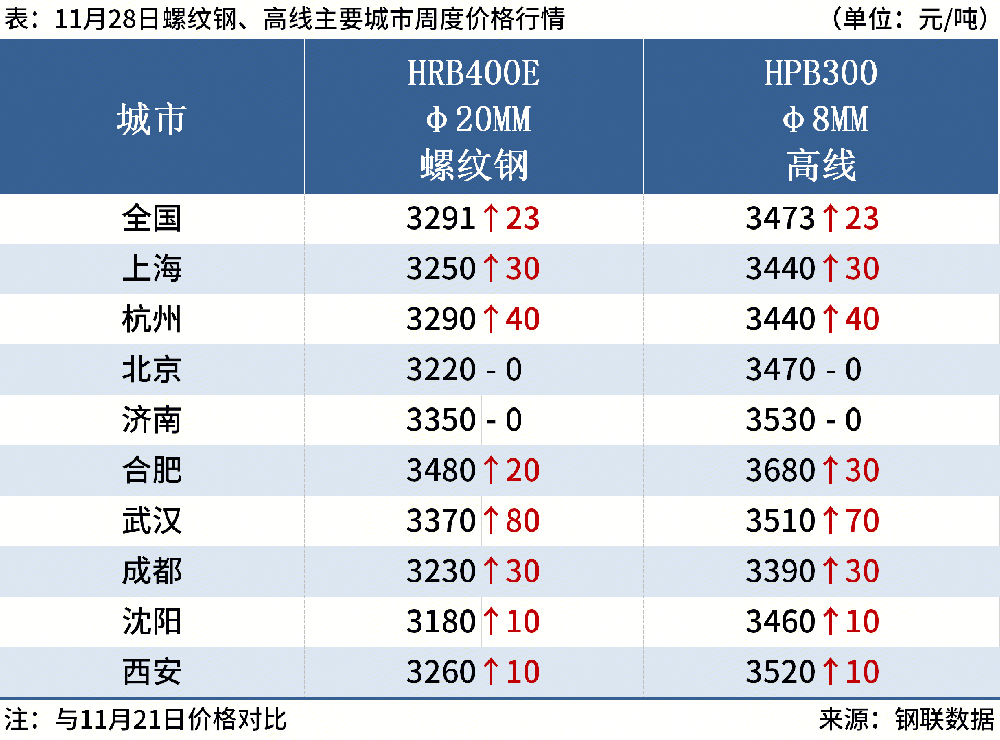 截至11月28日,全國主要城市20mm三級抗震螺紋鋼均價(jià)3291元/噸,周環(huán)比上漲23元/噸;8.0mmHPB300高線均價(jià)3473元/噸,周環(huán)比上漲23元/噸。