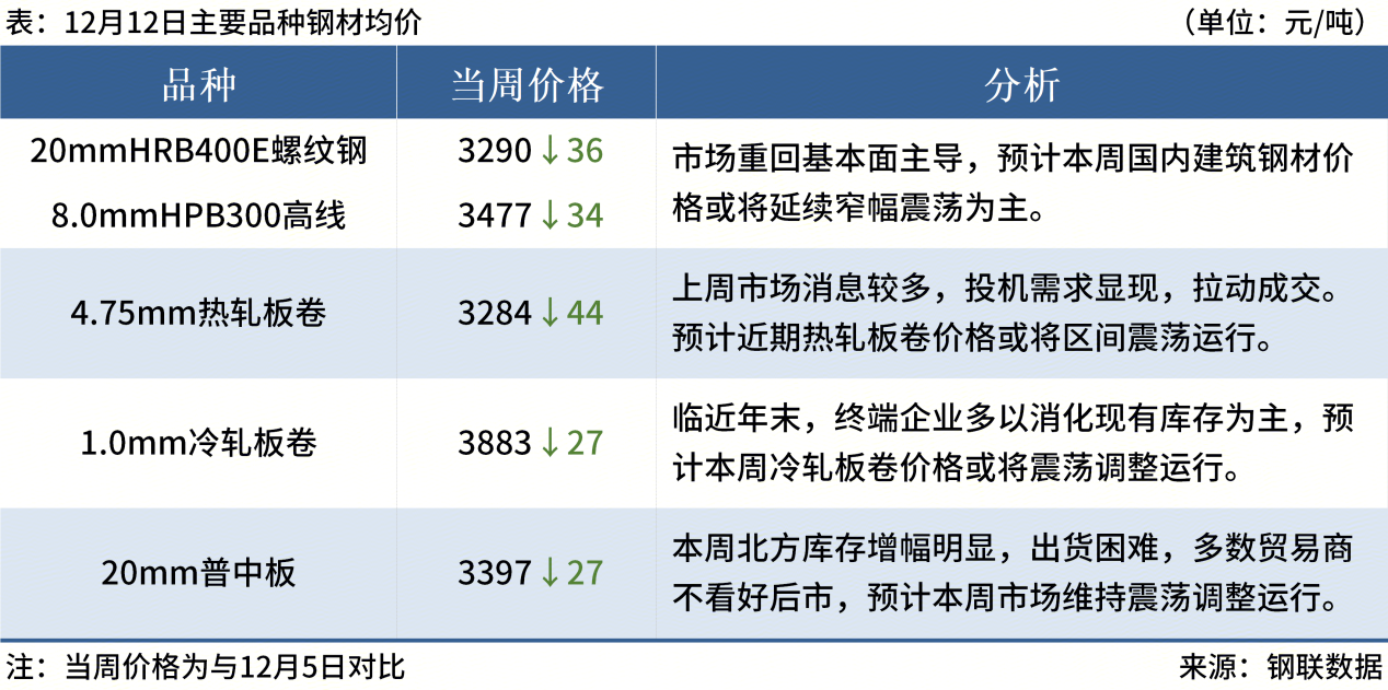 ◎ 12月8日-12月12日,全國螺紋鋼均價為3289元/噸,周環(huán)比下跌1.11%。供應(yīng)端,螺紋鋼周產(chǎn)量178.78萬噸,庫存479.5萬噸;需求端,消費(fèi)量203.09萬噸,建材周度成交量49.11萬噸。
