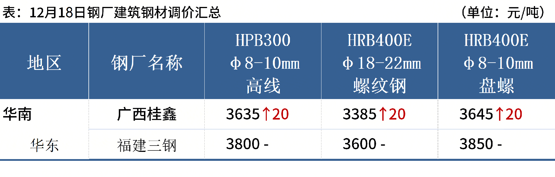 ◎攀鋼集團攀枝花鋼釩計劃12月19日開始停產(chǎn)檢修一座1200m3高爐,檢修影響日均鐵水產(chǎn)量0.35萬噸左右,復產(chǎn)時間待定。