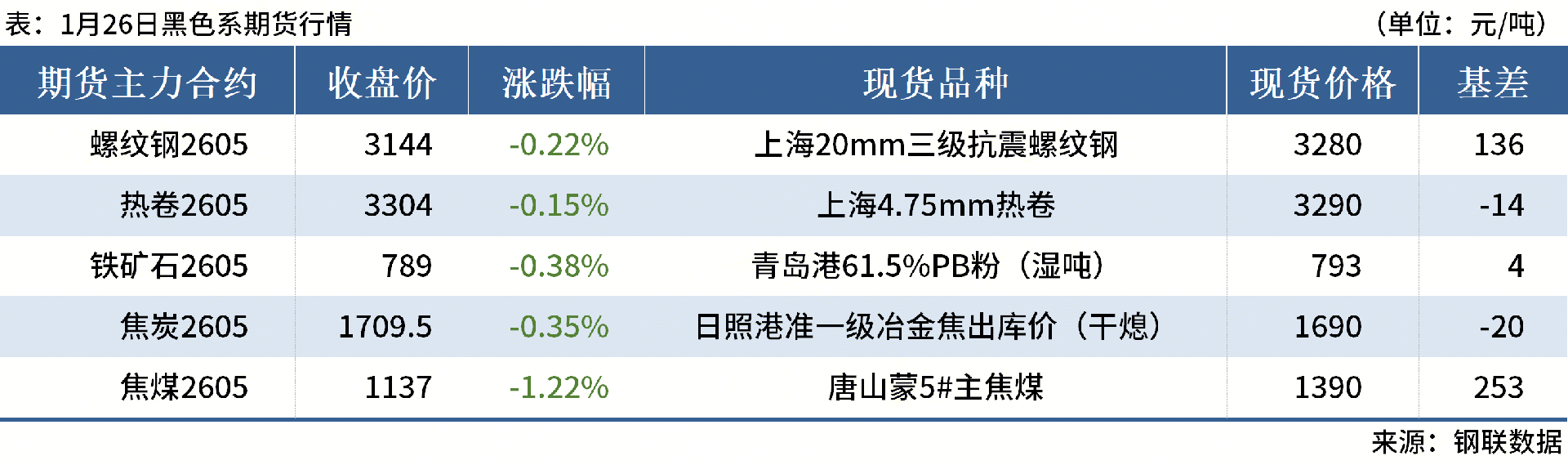 ◎1月26日,全國主港鐵礦石成交105.41萬噸,環(huán)比增33.1%;237家主流貿(mào)易商建筑鋼材成交7.61萬噸,環(huán)比減2.4%。