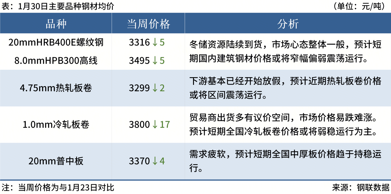 ◎1月26日-1月30日,全國螺紋鋼均價為3316元/噸,周環(huán)比下跌0.15%;螺紋鋼周產(chǎn)量199.83萬噸,增長0.14%;庫存475.53萬噸,增長5.18%;消費量176.4萬噸,下降4.92%。
