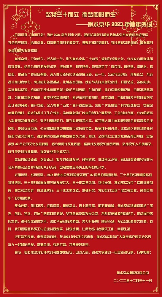 堅(jiān)韌三十而立 賡續(xù)奮進(jìn) 鑄夢(mèng)京華2023年度衡水京華業(yè)務(wù)經(jīng)理大會(huì)在衡水京華勝利召開律回春暉漸、萬(wàn)象始更新!2023年2月25日,衡水京華、鄭州京華、日照京華2023年度業(yè)務(wù)經(jīng)理大會(huì)在衡水京華制管有限公司隆重召開。衡水京華、鄭州京華、日照京華相關(guān)領(lǐng)導(dǎo)及業(yè)務(wù)經(jīng)理出席了本次會(huì)議。會(huì)議主題為“堅(jiān)韌三十而立 賡續(xù)奮進(jìn) 鑄夢(mèng)京華”···